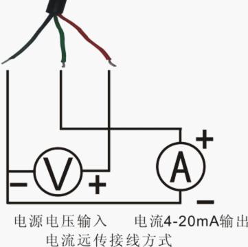 设备输出三线接口,红黑线是传感器电源接口,绿线或蓝色是电流输出接口。如下图所示: